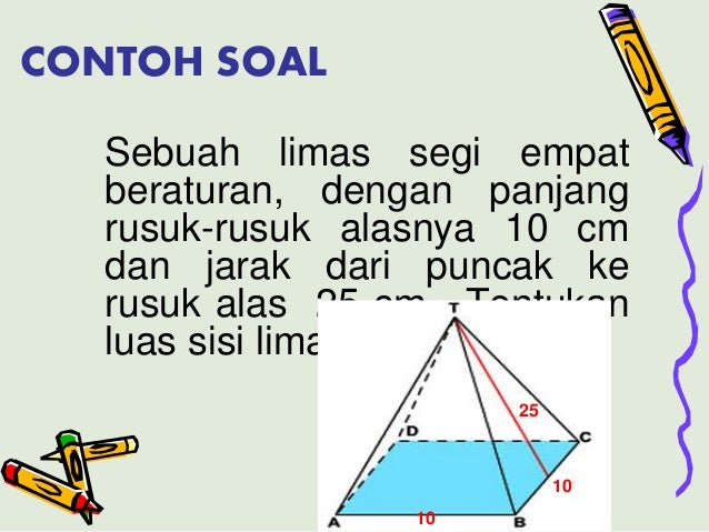 Limas Segi Empat Beraturan T Abcd Enak from data03.123dok.com Apakah jaring limas segitiga memiliki bentuk segiempat? X 20 x 25 4 x 10 x 25 40 x 25. Volume limas segi empat itu yaitu. Volume = 1/3 x 60 cm 2 x 20 cm = 400 cm 3. Diketahui limas dengan alas berbentuk persegi memiliki volume 1.296 cm 3. Limas segi enam beraturan c. Prisma segi enam beraturan 5. Bangun ruang limas sendiri juga memiliki banyak jenisnya seperti bangun ruang limas segi tiga, limas segi empat, limas segi lima, limas segi enam, dan lainnya.