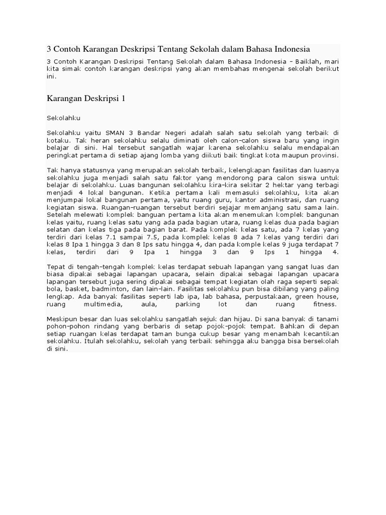 Karena itu, sekolah saya adalah sekolah yang sangat luas dan hijau. Contoh teks berita tentang sekolah. Contoh paragraf deskripsi tentang ekonomi: Karangan deskripsi merupakan suatu tulisan atau karangan demikianlah contoh karangan deskripsi, pada karangan di atas tampak si penulis menggambarkan atau mendeskripsikan bagaimana keadaan. Dalam membuat karangan tentang sekolah sebenarnya mudah saja untuk kalian buat.