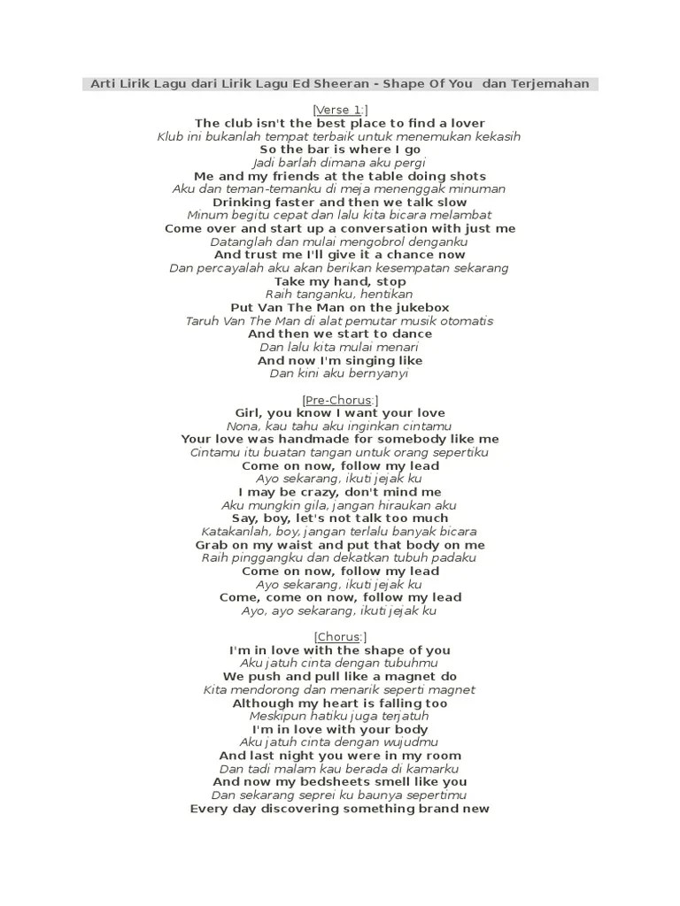 Lirik Shape Of You Terjemah Indonesia - Arti Lirik Lagu Dari Lirik Lagu Ed Sheeran Pdf : Pengin nyanyi shape of you tapi nggak hafal liriknya?. Download subtitle untuk video musiknya. Layanan mobile dari situs entertainment terbesar indonesia, kapanlagi.com. Shape of you by ed sheeran. Lagu shape of you adalah sebuah lagu yang dinyanyikan oleh penyanyi dan penulis lagu asal inggris ed sheeran. Daripada salah, mending baca dulu lirik lagu ed sheeran shape of you yang ada di artikel ini, yuk!